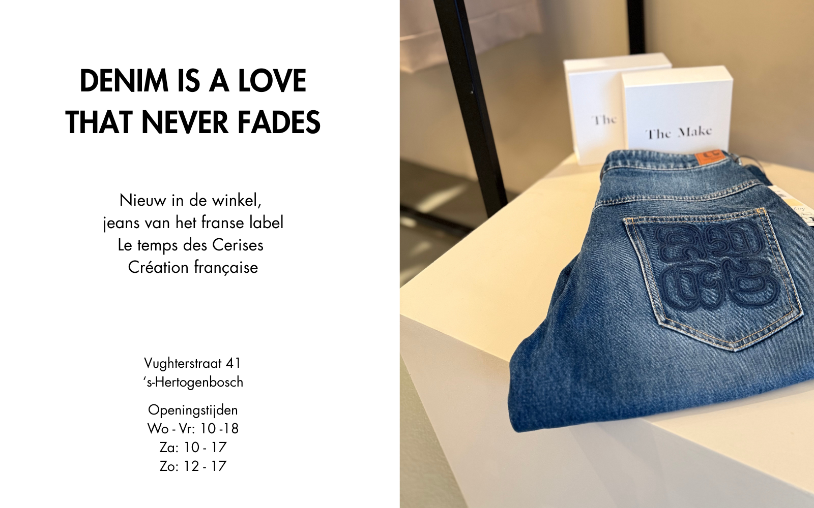 Denim zit in de basis van elke sterke garderobe. Wij introduceren het franse label Le temps des Cerises in onze winkel aan de Vughterstraat 41 in Den Bosch.
