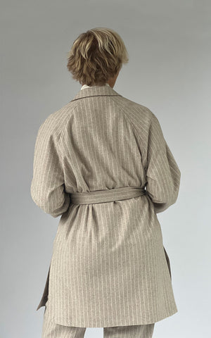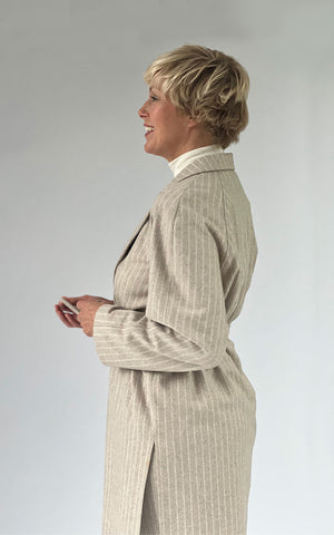 The Jones blazer with tie belt is crafted from a wool blend and features long slits in the side seams. This model is available in three colors. You can wear the blazer with the tie belt to highlight your waist, or leave it open for a more relaxed look. This blazer pairs perfectly with two matching pants options: the Babet pants and the Bella pants.