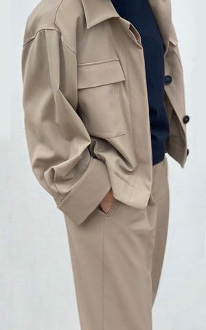 The bomber jacket silhouette is a classic that never goes out of style. With a flattering fit and a slightly oversized feel, it's the perfect outer layer for various occasions.