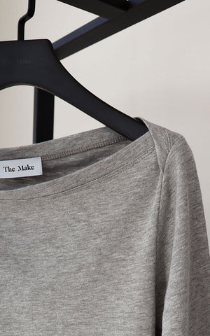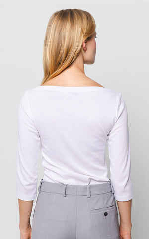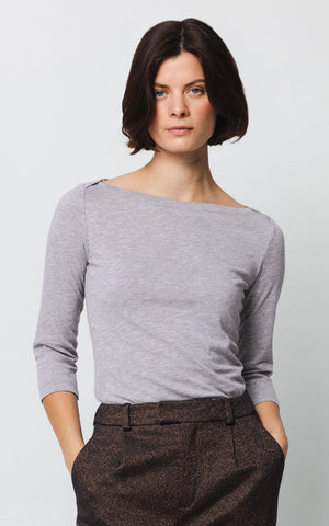 A classic feminine basic and wardrobe classic. Our Beau Tee is a regular fitting style with a sophisticated feel. This effortless style has a feminine boat-neck, ¾ sleeves, and a subtle wrap on both sides of the neckline. Wear a singlet underneath with wider straps for a nice, layered effect. The heavy cotton fabric has a nice comfortable stretch without added lycra and is available in white and grey mélange.