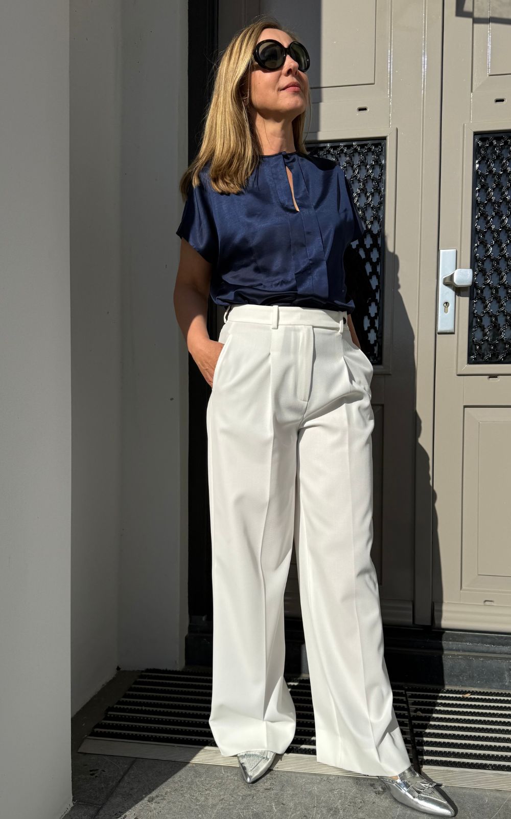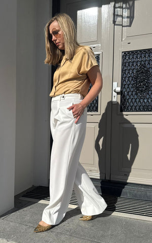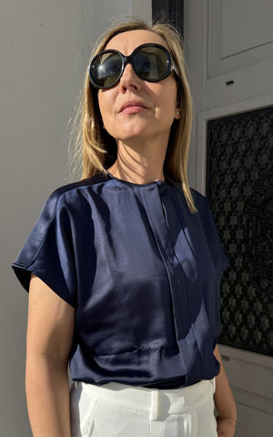 The Coco top has a relaxed fit with a feminine round neckline with slit and button closure. This top has a cut sleeve and is made of a shiny satin with a perfect drape.
